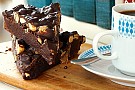 TOPPING:1) Smält chokladen till toppingen försiktigt över vattenbadeller i mikron. Rör ner nötterna och bredblandningen över kakan. Låt stelna i kylen.