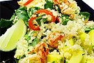 4. Rör ihop ingredienserna till dressingen och häll den över salladen. Servera med limesaft.
