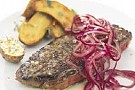 Sätt ugnen på 225°. Skölj potatisen väl och skär den i halvor. Lägg potatisen i en ugnssäker form eller långpanna. Pensla med smör eller olja. Stek i ugn ca 15 minuter. Krydda den stekta potatisen med salt och grovhackad timjan. Skala löken och skär den i skivor. Fräs löken i smör på svag värme i en stekpanna ca 10 minuter. Rör ner äppelmos eller farin. Hetta upp smöret tills det blivit gyllenbrunt i stekpannan. Stek biffarna i omgångar, 2 minuter per sida, beroende på hur genomstekt du vill att biffen ska vara. Salta och peppra biffarna.
