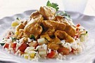 Skär kycklingfiléerna i strimlor. Skala och hacka vitlöken. Bryn kycklingköttet i smör i en teflonpanna. Krydda med salt och lägg över i en gryta. Tillsätt vitlök, tomatpuré, alla kryddor, vatten och crème fraiche. Låt grytan koka ca 5 min. Garnera med koriander eller persilja. Servera med kokt ris blandat med tärnad gurka, gul paprika och tomat.