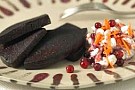 Skär blodpuddingen i skivor och stek dem i smör-&rapsolja i en stekpanna. Skala och riv morötterna grovt. Blanda morötter med cottage cheese och lingonsylt till en sallad. Servera blodpuddingen med salladen.
