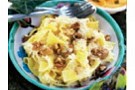Häll av pastan men spara ca 1 dl (för 4 port) av kokvattnet. Blanda pasta, nötter, parmesan, några skedar av kokvattnet samt lite olivolja. Salta och peppra. Rör i grädden och mjölken om du vill ha det krämigare.