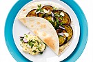5. Plocka och strimla persiljan. Servera tortillabröd med aubergineskivor, hummus, lök och persilja