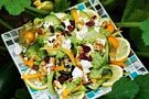 3. Smula fetaost över och toppa med valnötter och tranbär. Dekorera med physalis och citronskivor.