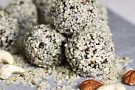 Mixa nötterna i en matberedare. Tillsätt först kakao och macapulver. Mixa sedan ned fikon, russin och dadlar. Tillsätt honung och sojamjölk. För över degen i en bunke och bearbeta till en jämn smet. Gör bollar och rulla i hampafrön.