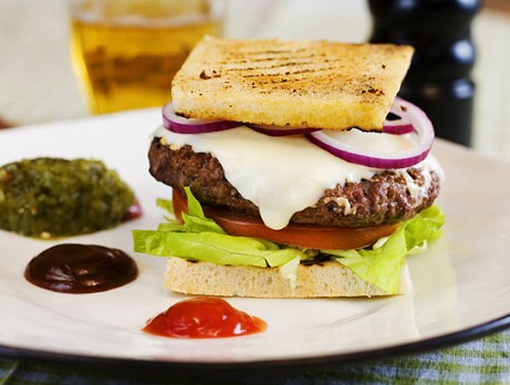 6. Lyft upp hamburgarna och lägg på ostskivorna direkt. Lägg sen sallad, tomat, rödlök, hamburgare och dressing mellan brödskivorna.