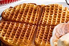 2. Vispa grädden och rör ner i smeten. Låt svälla. Pensla laggarna med smält smör och grädda våfflorna.