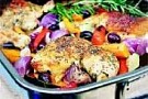 1. Ta fram en stor ugnslångpanna och smörj den lätt med olivolja. Lägg i frysta (otinade) kycklingklubbor och alla grönsakerna i stora bitar. Morötterna kan skäras i långa bitar, zucchini och paprika likaså. Rödlöken skärs i klyftor. Om du vill ha potatis med (gott!)så skala den och skär i båtar på längden.
