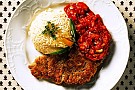 3. Lägg upp det kokta riset på tallrikarna. Lägg piccataskivorna bredvid, toppa med tomatsåsen och strö persilja över.