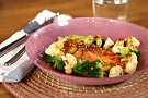 5. Lägg upp grönsaker, laxen på och slå soyavinegretten över alltsammans så smakerna går in och servera.
