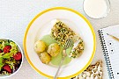 8. Servera fisken med kokt potatis, gräslökssås och en grönsallad med tomater.
