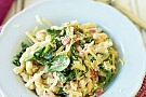Pasta med spenat, rökt sidfläsk och riven prästost