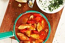 Bryn kycklingen i resten av oljan, lägg den över i grytan tillsammans med paprikan. Låt koka ca 5 minuter. Smaka av med salt och peppar.
