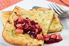 Häll smeten i långpannan, rör runt så att bacon och grönsaker fördelas jämnt. Ställ in i ugnen 25–30 minuter. Servera pannkakan med urkärnat, tärnat äpple blandat med rårörda lingon.
