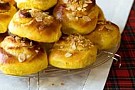 5. Sätt ugnen på 250°. Pensla bullarna med uppvispat ägg och strö över mandelspån. Grädda mitt i ugnen 8-10 min. Låt bullarna svalna på galler.