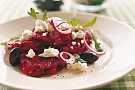 1. Skala och riv råa rödbetor, lök och kokt potatis grovt på råkostjärn eller i matberedare.