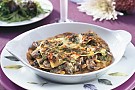 6. Varva i portionsformar eller en stor form lasagneplattor, svampstuvning och béchamelsås. Avsluta med ett lager lasagneplattor och bred på peston. Ringla lite béchamel på och strö resten av