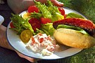 1. Dela, kärna ur och hacka paprikan. Blanda matyoghurt, vitlök och salt. Rör i paprikan.2. Halvtina quornfiléerna. Stek dem i smör i en stekpanna ca 10 min.3. Bred tandooripastan runt om quornfiléerna. Skär brödet nästan igenom och lägg i filéerna, paprikatsatsiki och sallad.