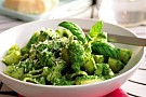 1. Koka pastan enligt anvisning på förpackningen. Skala och hacka lök och vitlök. Fräs i oljan i en kastrull utan att den får färg. 2. Tillsätt spenat och ärter. Häll på vinet och smula i buljongen. Peppra. Låt koka upp och sjud på svag värme ca 2 min. 3. Tillsätt grädden och myntan i såsen och mixa den slät. Blanda pastan med såsen. Servera genast med parmesan och myntakvistar.