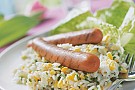 Vänd ner majs, gräslök och mini fraiche i det färdigkokta riset. Smaka av med kajennpeppar.