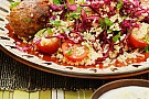 Kebab med krispig rödkålsbulgur