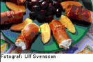 4. Blanda ricottaosten med samma mängd tärnad melon. Rulla in blandningen i den lufttorkade skinkan precis före servering. Servera 2–3 skinkrullar per person beroende på storleken på skinkan. Gör en vacker uppläggning med skinkrullarna varvat med tunna melonskivor och svarta oliver.