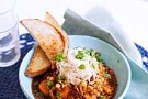 3. Hetta upp en stor kastrull med olivoljan och fräs lök, vitlök ,ingefära, morötter och champinjoner utan att det tar färg. Tillsätt quornfärs, krossade tomater, vatten, tomatpuré, spiskummin, paprikapulver, curry, socker, buljong, salt och peppar. Blanda runt ordentligt och låt grytan puttra på svag värme under lock ca 10 min.
