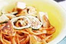 5. Sila av pastan och blanda med tomatsåsen. Toppa med grillad zucchini och halloumikuber.