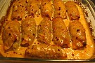 4. Rulla ihop till rullar. Lägg dem i en smord eldfast form med skarven nedåt.