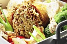 2. Smula sönder det vita brödet. Skala och hacka den gula löken och vitlöken fint. Hacka svampen. Fräs lök och svamp i smör. Blanda ner i brödsmulorna. Hacka persiljan fint. Kärna ur och skär äpplet i ytterst små tärningar. Blanda ner i brödblandningen och krydda med salt och peppar. Knäck äggen i en bunke och vispa dem. Rör ner äggvispet i brödblandningen.