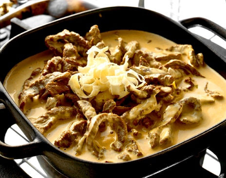 3. Skär lövbiffen i strimlor. Bryn den i smör och krydda med salt och peppar. Sila såsen över köttet, låt alltsammans få ett uppkok och flaga parmesanost över före servering.