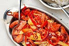 Dela, kärna ur och skiva paprikorna, Skala och skiva löken.