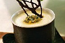 4. Smält gelatinbladet i en kastrull på svag värme. Blanda det med 1/4 av äggsmeten. Tillsätt det i resten av äggsmeten. Vänd till sist ner grädden. Häll upp i