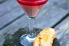 3. Gelé: Lägg gelatinbladet i kallt vatten. Värm under tiden hallonpurén med det vita vinet. Ta upp gelatinbladet och smält det i såsen.
