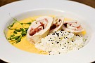 4. Sås: Strimla paprika och koka den med vatten, vinäger och grädde i cirka 10 minuter. Kör i mixer med crème fraîche till önskad konsistens. Salta.