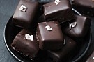 3. Skär tryffeln i 12 bitar. Smält försiktigt 100 g choklad i mikrovågsugn eller över vattenbad. Låt den svalna till fingervarmt. Lägg tryffeln på en gaffel och ös den smälta chokladen över med en sked. Lägg dem på bakplåtspapper. Lägg en saltflinga på varje tryffel och låt dem stelna.