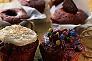 3. Dela 2 bakplåtspapper i vardera 4 delar och tryck ner 6 av dem i muffinsplåten. Fördela smeten däri ända upp till kanten. Grädda i nedre delen av ugnen 15 min. Ta försiktigt ut formen och lägg på önskad fyllning på varje muffins. Tryck till mycket lätt och fortsätt grädda 10 minuter.