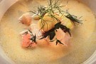 Skala och dela potatis och morot i mindre bitar. Koka nästan klar buljong. Skär fisken i mindre bitar och lägg ner i soppan, låt koka med 3-4 minuter. Häll på mjölk, grädde, pepparrot och dill. Smaka av med salt och peppar