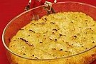 3. Häll allt i en smord liten form. Gör toppar med en gaffel. Klicka 2 msk smör i små bitar ovanpå och grädda ca 10-15 min tills lådan får en fin färg.