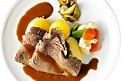 1. Skala och skiva löken. Häll porter, svart vinbärssaft och soja i en gryta. Lägg i enbär, pepparkorn, timjan och buljongtärningar. Tänk på att köttet också ska få plats, men det får gärna ligga trångt. Koka upp innehållet i grytan och lägg sedan i köttet och sjud på låg värme under lock i omkring 90 minuter.