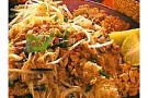 Hacka scampi och fläskfilé grovt. Tillaga nudlarna enl förp och spola dem kalla. Hetta upp oljan i en stekpanna och lägg i vitlök, chili och fläskfilé. Stek under omrörning i en minut, lägg i scampin och stek ytterligare en minut på hög värme. Tillsätt nudlar böngroddar, fisksås, socker och lime. Knäck i ägget och rör om rejält så ägget blir som omelett trådar i woken. Låt det sjuda någon minut, strö sedan på koriander och jordnötter.