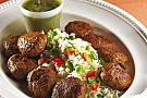 Värm en stekpanna med olja och stek bitarna på medelvärme 3-4 minuter per sida. Servera med pestosås och grönsaksris.