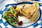 6. Lägg hälften av aubergineskivorna i botten av pajen, fördela köttfärs över och lägg på resterande aubergine. Häll över äggstanningen och strö sist över riven ost. Grädda pajen på nedersta falsen ca 30-35 min. Servera med vitlöksyoghurt och sallad.