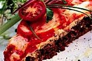 3. Lägg köttfärsfyllningen i pajskalet och bred över crème fraîche. Riv osten och skiva tomaterna. Fördela tomatskivorna ovanpå och strö till sist över osten.