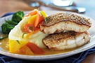 Gör så här- texten är avsedd för 4 portioner. Skär fisken i lagom stora portionsbitar. Lägg dem på ett fat och krydda bitarna runt om med salt. Låt stå 20 minuter i rumstemperatur före stekning. Apelsinmorötter: Skala och skär morötterna i ca 2 cm stora bitar. Skala tunna remsor av en 1/2 apelsin med potatisskalare, se till att inte få med något av det vita. Pressa ut juicen från den skalade apelsinen. Skala den andra apelsinen med kniv och skär i bitar. Koka upp vatten och fond med skalstrimlor och juice i en kastrull. Lägg i morötterna och koka al dente i kastrullen, 10–15 minuter, lägg i apelsinbitarna de sista 2 minuterna. Häll av morötter och apelsin, men spara kokvattnet. Häll tillbaka vätskan i kastrullen och koka ner tills ca 1/3 återstår. Tillsätt honung, smör, morötter och apelsinbitar. Låt koka upp och krydda med dragon, salt och peppar. Strö sesamfröna runt om fisken. Stek ca 4 minuter på varje sida i smör i en stekpanna. Servera genast fisken med morötterna och t ex pressad potatis eller ett gott mos. För alla Fri från gluten.