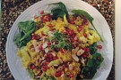 Fördela bladspenat på tallrikar (eller stort uppläggningsfat) häll quinoan över.