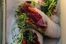 Fyll bladen med grönsaker och frukt och rulla ihop till wraps.