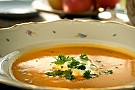 11. Häll upp soppan i en tallrik, lägg en dryg matsked creme fraiche i mitten, använd den fina sidan på rivjärnet och riv över 1/4 dels citrons skal över soppan. Servera soppan rykande het med en bit gott bröd.