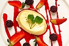 3. Skär de färska jordgubbarna i klyftor. Droppa jordgubbssås i ett vackert mönster på 10 assietter. Placera därefter en pannacotta på var assiett. Fördela med jordgubbsklyftor och björnbär på varje portion. Dekorera med citronmeliss.