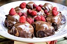 Bryt chokladen i bitar. Smält den i en kastrull på svag värme tillsammans med grädden. Rör i kakao och honung. Häll chokladsåsen över profiterolesen, garnera med hallon och servera genast.
